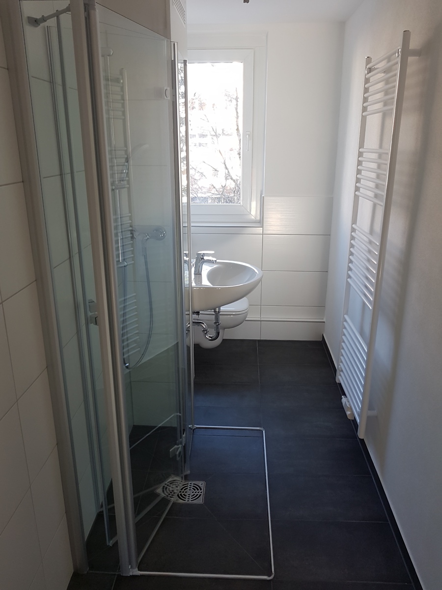 Die Wohnung verfügt über ein Bad mit Dusche und Fenster. Von dem großen Balkon haben Sie einen sehr schönen Blick in das grüne Grundstück.
